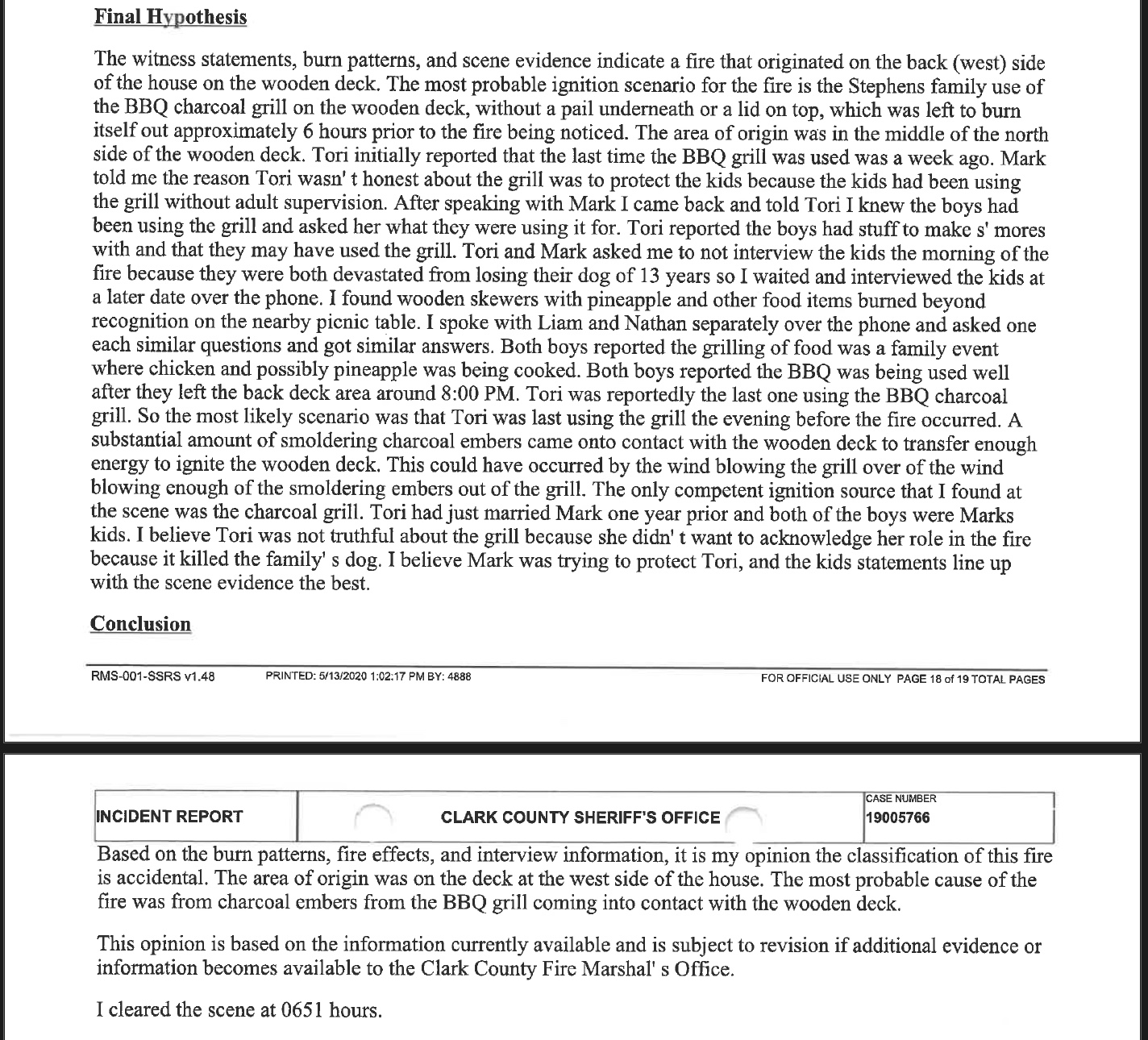- The fire at his home, which he and his wife were found to be at fault for by the Clark County Fire Marshal—and which they blamed on the children. View Final Hypothesis View the full fire report here